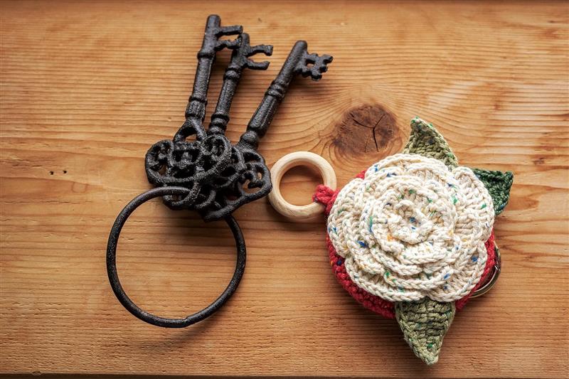 藍色、白色、粉紅色、紫色的編織花朵,和綠色樹葉搭配出華麗可愛的特製花環,為室內空間點綴季節氣氛。