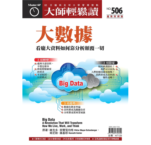 繼數位革命後,大數據潮流再度顛覆我們的生活、經濟、社會、科學各層面,造成巨大轉變、勢不可擋的趨勢以及隨之而來的種種隱憂。但在不久的將來,當數據化更為普遍,我們一定會把它視為理所當然。