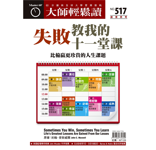 曾獲選為「世界領導大師」排行全球第一、出版過無數暢銷領導書籍、訓練多家企業領導人的領導界專家約翰.麥斯威爾,在近50 年面對各行各業無數領導者成功及失敗的案例中,歸結出能夠幫助我們克服困頓、處理問題、面對失敗、邁向成熟11 堂必修課程。他告訴我們,成功往往是來自關鍵性的失敗,只要保持不斷學習的心態,就能掌握最強的致勝武器。