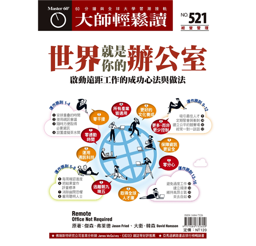 本書就是提供這種升級,從心態到實際運作,層層揭露許多雇主不願面對的真相。並且闡明遠距工作的諸多好處:容易接觸到世界最優秀的人才、減少通勤時間的損耗、把時間用在提升工作品質上、以信任取代監督,創造勞資雙贏的局面等等。最重要的是,這些論述絕非空談理論,而是來自實際執行的經驗。
