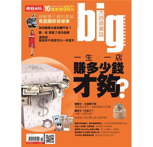 《big大時商業誌》10月號幫你計算要賺多少錢才夠,台灣這幾年夠有錢嗎?比一比新加坡人處境又如何?作家張國立談他怎麼做的財富自由;畫家桃樂絲如何賺到第一桶金;獨立書店、特色咖啡店、文創公司的算盤要怎麼打?夢想與現實的平衡點又該怎麼抓?