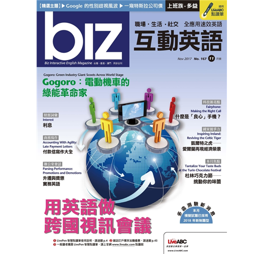 每個月,我們也藉由提供讓你登上頂點的秘訣來向我們的讀者表達感謝。在【商務應用會話】裡,藉由視訊會議的主題,你能夠透過科技來建立團隊合作。在【財經詞彙】單元,你會學習如何有效利用利率,讓自己安然度過經濟停滯期。最後,利用【辦公室會話】的升遷和降職準則,讓你有效地評鑑員工。