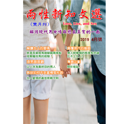 這是一本有關於兩性新知的雙月刊,內容以長期連載各主題的短篇文章為主,預計發行兩年份,雜誌主體是以「輕雜誌」類的電子雜誌形式發行,文章出處均是和我們合作的特約作者所撰寫,內容偏向於一般兩性評論及探討兩性關係的散文,各個主題對於現代時下男女有著深入人心又兼具發人省思的實用性價值,共可分為五大主題:解讀女人的愛情、渣男面面觀、教妳如何不走感情冤枉路、顛覆現代的婚姻、30歲女子單身抒情曲,,不論您是身處在單身或是婚姻狀態,也許您正處於兩性關係的五里霧中,本雜誌正是可以為您提供心靈與情感解惑的一帖良方。