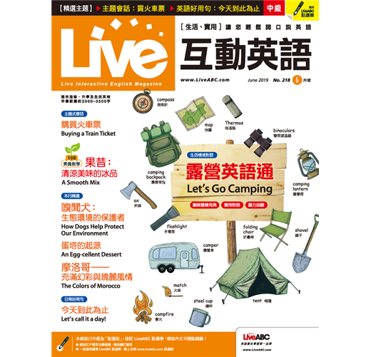 豔陽六月天,許多人會去郊外踏青,享受大自然,因此本期的【生活情境對話】要介紹各種露營裝備的英文說法。在炎熱的天氣裡,以生鮮蔬果打成的果昔( smoothie )是消暑聖品,【健康生活】提供兩種簡單的食譜,讓你可以自己動手做健康又美味的果昔,若再配上一個美味的蛋塔(egg tart)當點心,就再愜意不過了。不過你是否曾想過蛋塔是怎麼產生的呢?【追本溯源】單元告訴你!