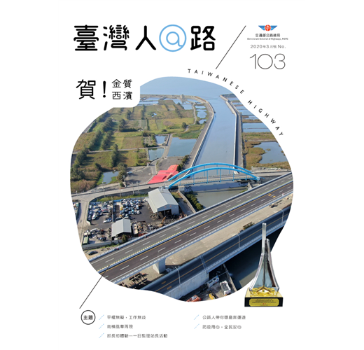本次103期「賀!金質西濱」為題,專題報導西濱快速公路獲公共工程金質獎,因應時局,公路總局針對客運運輸、監理服務等積極防疫,強化公路網絡的公共衛生,更多豐富精采的內容都在公路總局臺灣人@路。