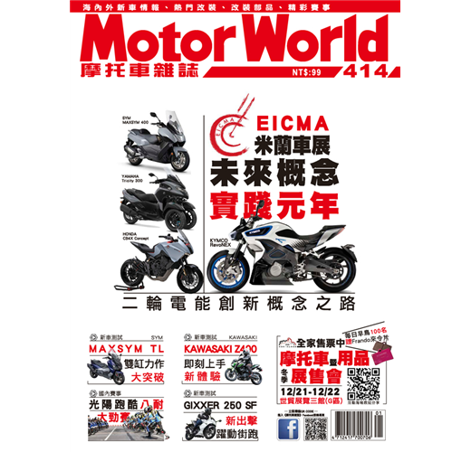 國人引頸期盼2年的三陽旗艦:MAXSYM TL終於粉墨登場,挾帶一身好料的TL會在國內掀起多少波瀾十分令人期待,本刊也針對性能動態進行詳盡的測試。能文能武的運動街車「KAWASAKI Z400」在排氣量增加後是否持續KAWASAKI的造車理念,為狂傲不羈的Z車系再添榮耀?