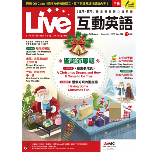 本期【主題式對話】的「過個好玩的聖誕節」要帶你認識聖誕節時常玩的遊戲,而【大師名作選】的〈聖誕夢成真〉則透過這個故事告訴大家聖誕節的精神在於與人分享、善待鄰人。這次我們就來告訴您逢此佳節的祝賀語,趕快學起來,就可以向您的親朋好友獻上您的祝福。