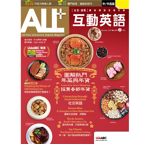 春節假期過後,新的學期緊接著展開,我們也在二月號到七月號的雜誌中增加了三個學測試題的單元。本期分別是文意選填「巴西莓:奇蹟食物還是環境災難?」、綜合測驗「笑一個:為什麼拍照時會歪著頭?」 及篇章結構「顏色與性別意義的變遷」,再加上混合題型單元「你對自駕車抱持什麼看法?」,幫助你逐步熟悉、掌握這些測驗題型,快速提升應考實力!