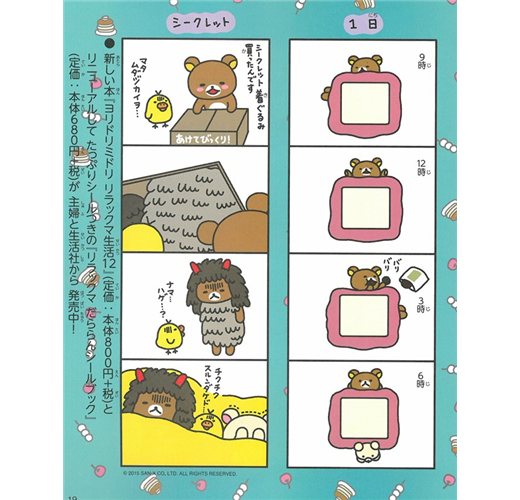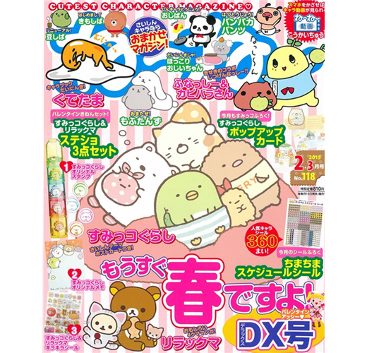 因為有很多人都喜歡「角落」,所以特別將動物擬人化的「角落生物(暫譯)」,去年推出後馬上就獲得許多人的喜愛,而這樣的「角落生物(暫譯)」終於在本誌封面上登場。以「角落生物(暫譯)」為首,本期除了收錄許多卡通明星的可愛插畫之外,還要附上「角落生物(暫譯)」的印章組4入、原創便條紙、立體卡片以及明信片。另外,還有懶懶熊的閃亮貼紙以及360張人氣卡通明星的行事曆用貼紙。