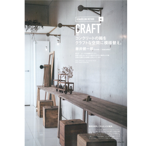 首先在本期刊頭特集單元中我們邀請到室內裝潢設計師佐佐木一也,請他分享其五十年屋齡老式公寓自宅的重新裝修實例。我們更以詳細圖說方式,一一徹底分析佐佐木一也打造煥然一新居住空間的過程以及每間房間的構成要素,包括宛如飯店接待區的客廳、用異材質打造出來沉穩感餐廳、紐約地鐵風浴室、摩登小和室、讓房間風格劇變的門、其他各種小細節的改造設計。此外本期還有時尚工業風配件擺設型錄、其他精采重新裝修技巧及實例…等精彩主題內容。