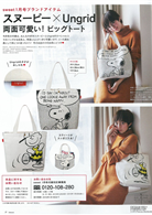 針對不同的對象和場合,在此將和人氣模特兒一同擬定年末年初最新的穿搭計畫,鈴木EMI的聖誕約會造型、聰子和栞里的女子會時髦氣氛、萌香的可愛居家服、Juliana的新年參拜華麗和服…等等,提供許多更時尚可愛的優質點子。另外還贈送了SNOOPY×Ungrid的雙面設計大托特包,也很令人心動哦。