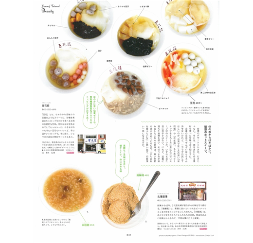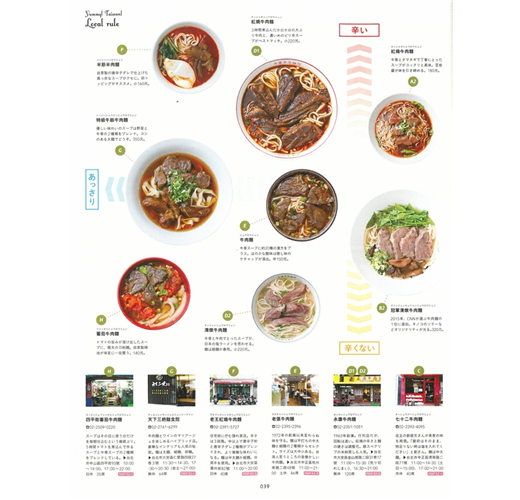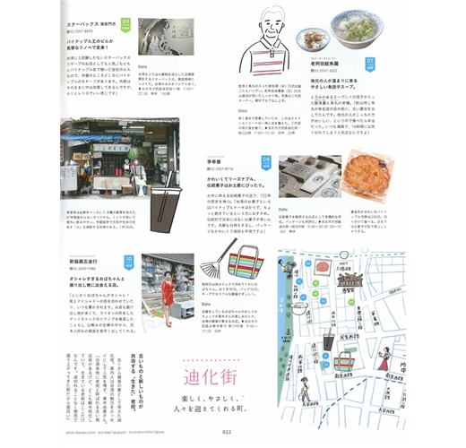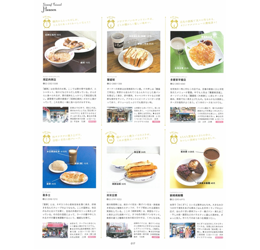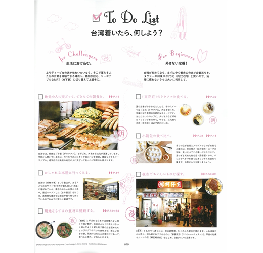此外,還有東京中目黑高架橋下新興的美食街簡介,全長約700公尺的高架橋下共有28間美食店鋪,其中不乏來自日本各地的美食名店,再加上營業時間直到深夜,只要來得及搭上末班電車回去就可以盡情地品嘗道地的美味料理了。另外還有必嘗的台灣小吃目錄和地圖、台北小吃新文化和限定飲品,台中和台南等地的美食等必知的各種資訊。