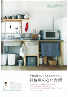 廚房收納創意思考每個家庭都有自己的飲食喜好、有自己的私房菜、有自己愛用的廚具和雜貨,再加上不一樣的空間規劃、不一樣的下廚習慣,創造出百人百樣的廚房物語。本期天然生活就走訪了多位生活達人的自家灶腳,從大家的生活經驗中,歸納出各式各樣的收納整理術。有檯面上幾乎什麼都沒有的廚房,有剛啟用沒多久,還要調整中的廚房,有50年老屋的廚房改造實例,有捨棄櫥櫃門的廚房、善用吊掛收納的廚房…等等,不但要研究各種看得見的、看不見的整理技巧,也藉機認識不少好用雜貨,一講到廚房收納就氣餒的各位,不妨來參考看看吧。