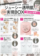 隨刊附贈「VOCE×PAUL&JOE水嫩透明肌彩妝組」,內含親肌水凝粉餅體驗1G體驗餅蕊1入、糖瓷防曬隔離乳0.4ml試用包2入、橄欖修護美肌精華油4ml試用包2入、橄欖草本保濕乳液3ml試用包2入、專用化妝棉2枚、專櫃膚色診斷卷(日本專櫃用,試用店鋪請參照內頁說明),還有由彩妝師Igari Shinobu與PAUL&JOE合作的飛鳥圖案彩繪收納盒。誌上限定超值組合,等你來帶回家。