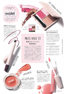 隨刊附贈小嶋陽菜時尚小報、 snidel春色彩妝組&花漾透明收納夾,彩妝組內含四色眼彩盤(淺粉、桃粉、深咖啡、金色)、葡萄酒紅唇彩筆、水潤亮澤粉橘唇蜜、珊瑚粉兩用唇頰霜;獨家設計花漾透明收納夾和上期附錄同款不同色。