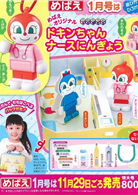 快樂遊戲讀本1月號附贈麵包超人醫護人員遊戲組,提供麵包超人、細菌人、藍精靈、蜜瓜超人的紙偶,醫院場景、聽診器、針筒、耳溫槍…等可愛紙勞作,還有護理師造型的紅精靈玩偶。身體不太舒服,或是意外受了傷,都可以來到麵包超人醫院尋求幫助。