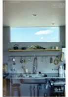 廚房的餐具櫃、桌子都是喜愛的老家具,並使用不鏽鋼流理台、砂漿牆壁,搭配出不會太冰冷,也不會過於甜膩的氣氛。又大又明亮的窗戶則是屋主的願望,為廚房帶來開闊風景。