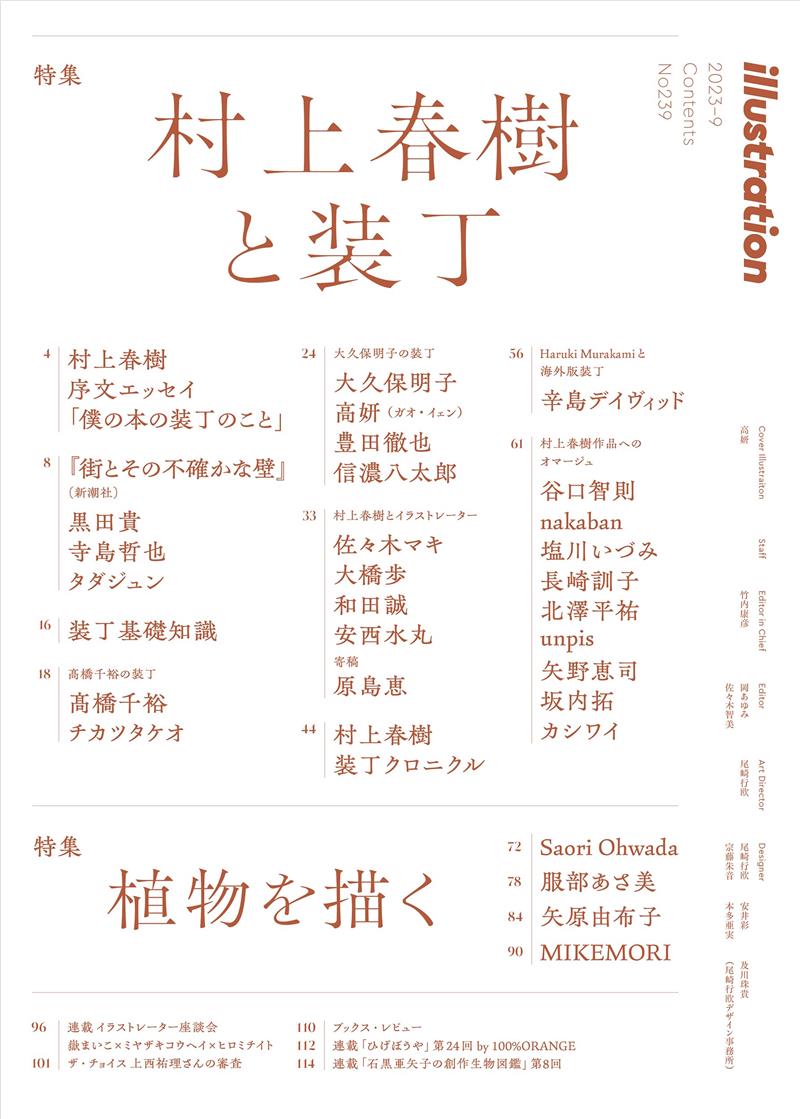 約70ページにわたって、村上春樹さんの著作の「装丁」を特集します。最新長編『街とその不確かな壁』(新潮社)を含めた近年の小説作品を中心に、装丁家やイラストレーター、編集者など、1冊の本が完成するまでに携わった方々を取材。また、村上春樹さんから序文エッセイ「僕の本の装丁のこと」をご寄稿いただきました。