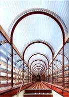 辦公室的天花板挑高6.5公尺,在辦公桌之間穿插了細長的白色柱子和植物盆栽,法蘭克・洛伊・萊特設計的美國莊臣總部,跳脫了人們對辦公空間的既定印象,以優美曲線打造出洗鍊氣氛。