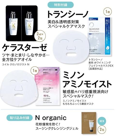 附加商品說明:由日本製藥公司所推出的美白品牌TRANSINO,隨著紫外線逐漸變強,本期除了要附上TRANSINO的美白面膜,還要附上為敏感肌與乾燥肌誕生的低刺激性護膚品牌MINON的敏感肌用面膜,除此之外,還要附上法國高級美髮沙龍品牌KERASTASE的護髮精油試用組。(成分與注意事項請參考外包裝說明)