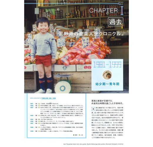幼少期到青年期、個人活動之前、個人活動期之一、個人活動期之二、個人活動期之三,BRUTUS試著將星野源的音樂人生分成五大段落,也蒐集他每個時期愛聽的歌單,解析星野源的成長軌跡。