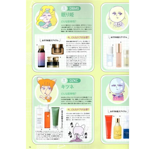 容易長痘痘、常常睡眠不足、覺得皺紋比去年多、不太吃黃綠色的蔬菜、手腳冰冷…等等,回答各種提問之後,就能歸納出自己的肌膚特質,總共有16大膚質的實用對策和建議產品,歡迎各位參考。