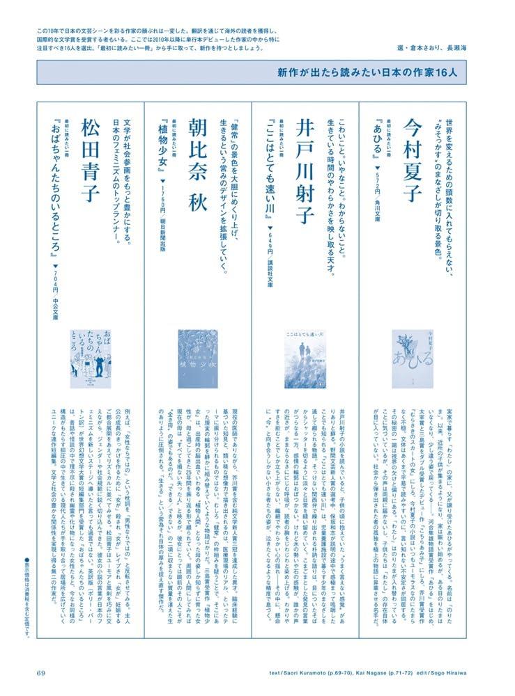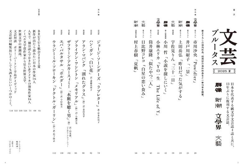 1946年創刊的「群像」在2019年以「文」與「論」為主題進行改版,而迎接創刊122年的「新潮」,據說是世界上最古老的商業文藝誌,另外,以小林秀雄為首,由日本文壇名家創辦的「文學界」,希望大家可以透過本誌來發現文字的全新可能性,還有1933年創刊後,以連結世界為理念,不斷介紹日本文學現況的「文藝」。