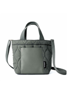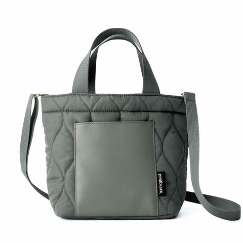 上品なグレーのキルティング生地に、同色のレザー調ポケットをあしらい、きれいめにもカジュアルにも映えるシックなデザイン。
