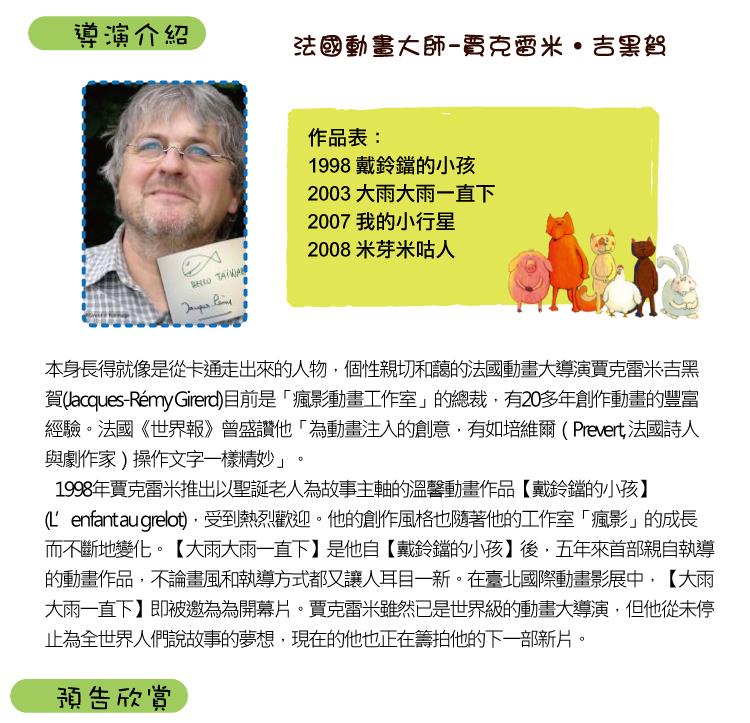 本身長得就像是從卡通走出來的人物,個性親切和藹的法國動畫大導演賈克雷米吉黑賀(Jacques-Remy Girerd)目前是「瘋影動畫工作室」的總裁,有20多年創作動畫的豐富經驗。法國《世界報》曾盛讚他「為動畫注入的創意,有如培維爾(Prevert, 法國詩人與劇作家)操作文字一樣精妙」。