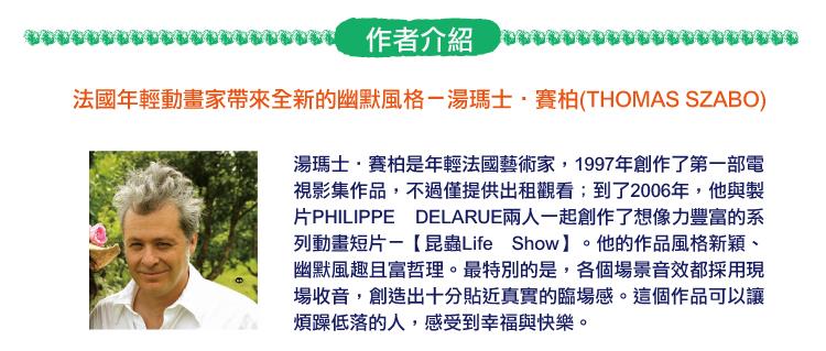 湯瑪士‧賽柏是年輕法國藝術家,1997年創作了第一部電視影集作品,不過僅提供出租觀看;到了2006年,他與製片PHILIPPE DELARUE兩人一起創作了想像力豐富的系列動畫短片─【昆蟲Life Show】。他的作品風格新穎、幽默風趣且富哲理。最特別的是,各個場景音效都採用現場收音,創造出十分貼近真實的臨場感。這個作品可以讓煩躁低落的人,感受到幸福與快樂。