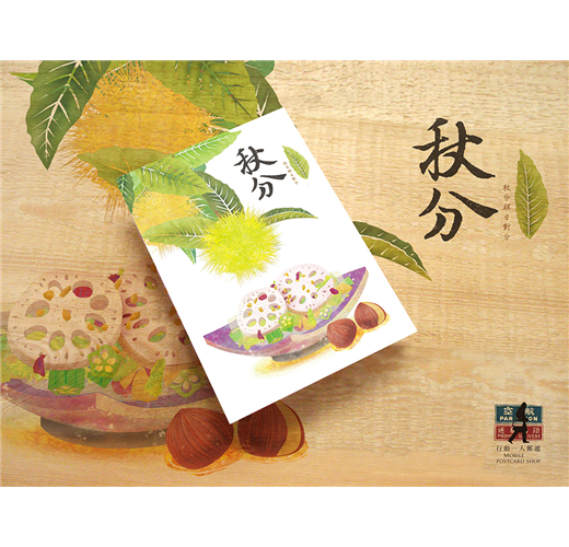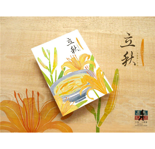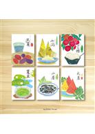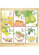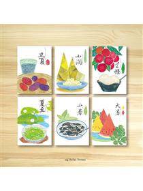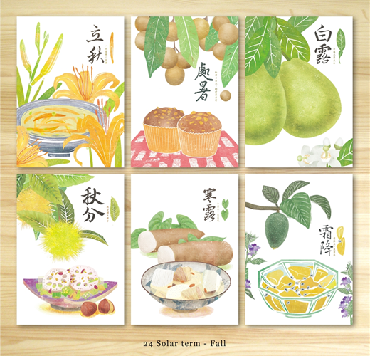 搭配節氣與食材為主題,運用版畫風格呈現不同季節的蔬菜或飲食。介紹台灣在地食材。喚起季節變換之間的味覺記憶! 搭配依序為,立秋:金針、處暑:龍眼、白露:柚子、秋分:栗子、寒露:山藥、霜降:愛玉。