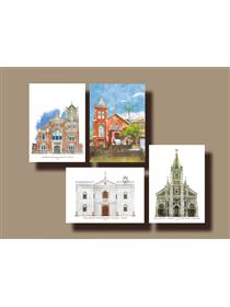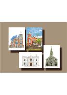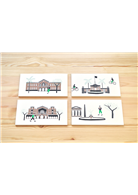 明信片一共四款,分別是校門堡壘、舊總圖、總圖書館、傅園,可單款或套組收藏,亦可搭配信封作為禮品贈送。