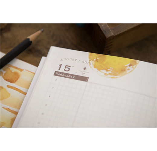 除了彩圖視覺上的享受外,在日計畫的規劃上也處處可見漢克的用心,左頁有可瀏覽當月日期的迷你月曆,右頁印有月份頁標。單日頁面以5mm方眼格為基底,搭配直式時間軸的設計,除了有星期、國農曆日期的標示外,還有小巧可愛的月相表可供參考。2018年就來跟著漢克一起畫手帳吧!