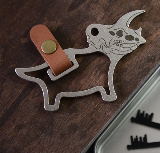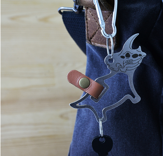 三角龍因為頭部的三根大角而著名,活躍在約6800萬年到6500萬年前的白堊紀末期,獨特的外形使得牠們成為恐龍電影、遊戲及電視節目中的主角。三角龍雖然是草食性動物,生物學家研究發現頭角用於抵抗掠食動物、求偶時的展示。三角龍鑰匙環鏤空的身體可以收納很多鑰匙,上面的洞可以自行搭D扣或繩子當成吊飾;Desk+1把三角龍的頭角變成開瓶器,增加使用功能性。