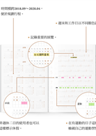 時效日誌一直是 Take a Note 從成立以來的核心設計與起點。從獨家開發的直式二日一頁時間軸+橫式迷你週曆開始,每一年我們都會做許多改良與調整,不論你是重視時間管理的機能派使用者,或是喜歡裝飾剪貼寫日記不需要行程管理的自由派使用者,這本手帳都能夠完全依照你的喜好靈活運用。這本手帳有很多細節與功能,但極盡可能的讓設計的干擾降低,讓你的書寫成為手帳的主角,成為你專屬的道具之一。