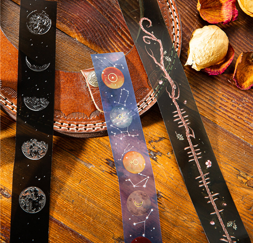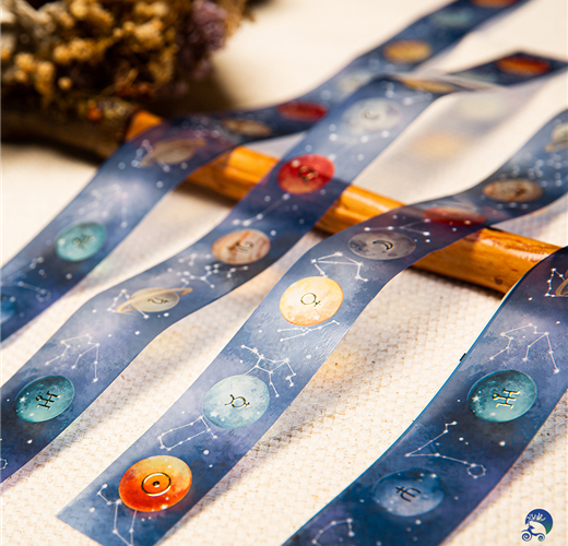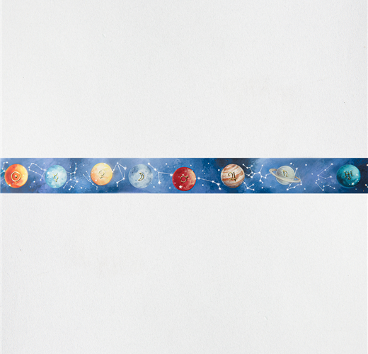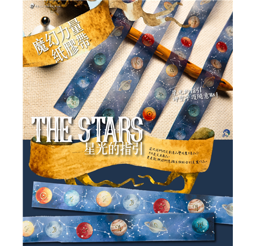 太陽與九大行星的星光力量,模擬星體們真實在宇宙中的形象,各自閃耀著美麗的光芒,將占星符號以立體燙金的手法躍然紙上;當指腹碰觸到時,瞬間感覺到來自星體的全新感受。每一個星體都象徵著一位神靈的一段神話,當然也是一種文化,將他們貼在眼界所及之處,充滿無限的故事。