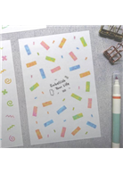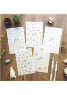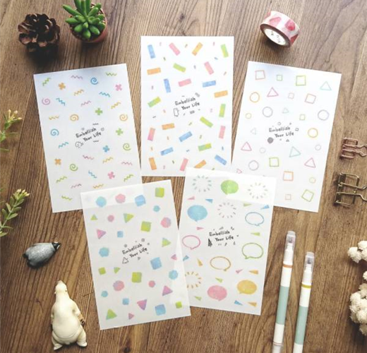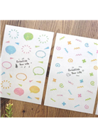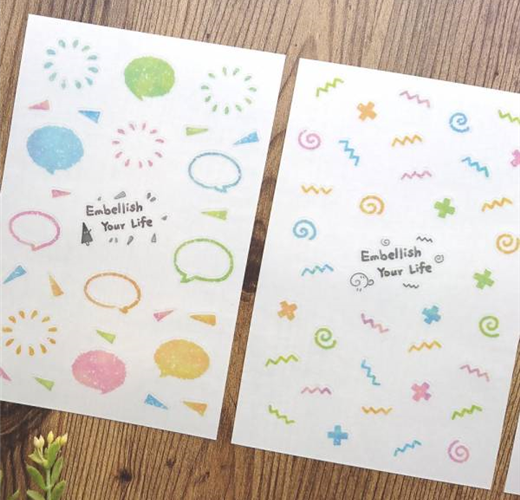 Dimanche迪夢奇新推出的感壓貼,使用的方式跟傳統貼紙很不一樣,貼紙本身沒有任何刀模,只要把想要使用的圖案,連同背後的離型紙一起剪下,撕掉離型紙後,將貼紙壓在想要黏貼的位置上,稍微反覆施壓使它完全與紙張貼合,就可以將表層的透明保護膜撕下。
