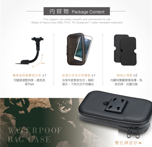 ‧包款採用雙拉鍊全包式設計,可左右開闔,雨水不輕易滲入。