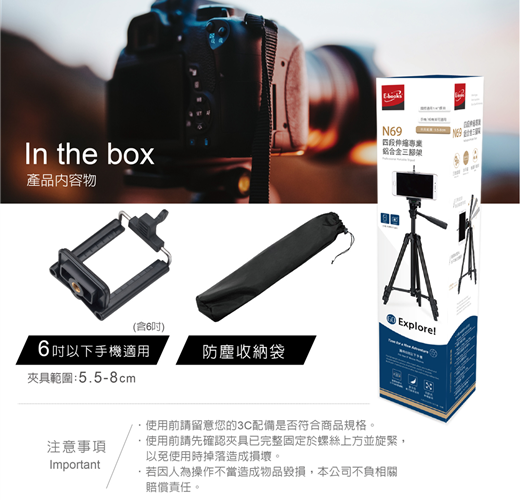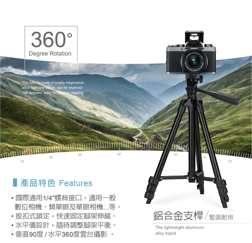 ‧ 國際通用1/4"螺絲接口,適用一般數位相機、