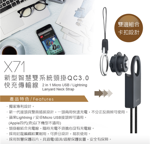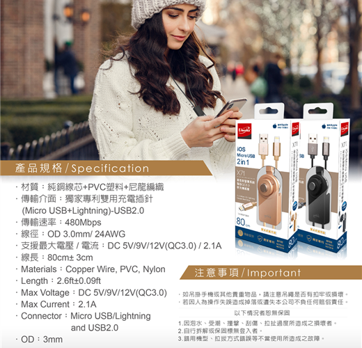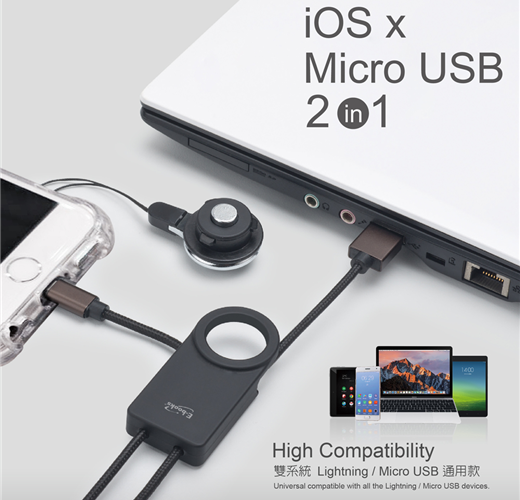 .傳輸介面 / 速率:獨家專利雙用充電插針(Micro USB+Lightning)-USB2.0/480Mbps