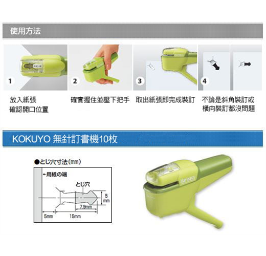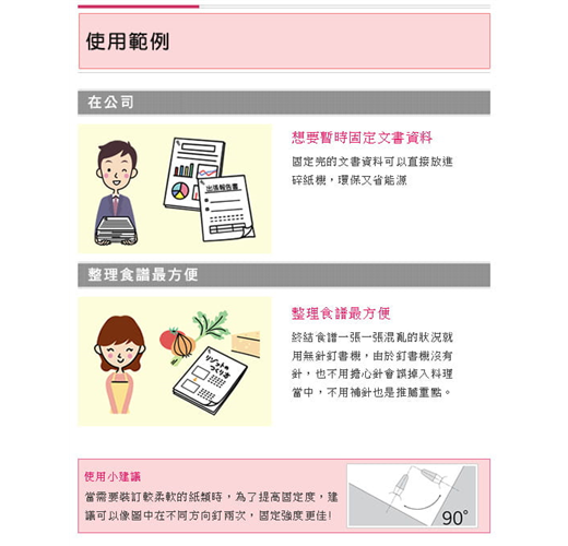 隨著紙張的不同,可裝訂張數可能會減少。對於較柔軟的紙類(如複寫紙、感熱紙等)裝訂的強度可能較弱。