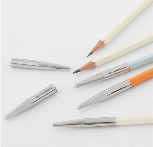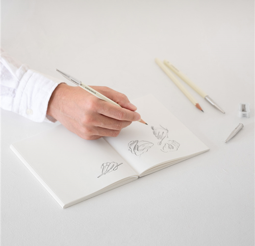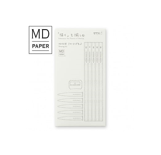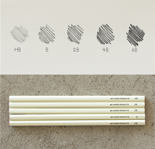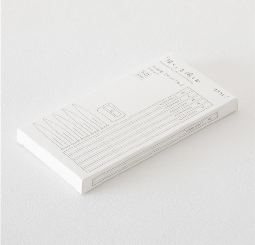 『MD鉛筆 DRAWING』外盒包裝是以素描方式呈現紙張積層意象的設計。此外,還備有,將廣泛包含各種濃度的鉛筆、筆蓋及削鉛筆器整合為一,最適合搭配『MD 棉紙筆記本』。鉛筆共有5種類,適合描繪纖細線條的B及HB、及適合畫出柔軟線條的2B、4B及6B皆一應俱全。讓你全心感受描繪的愉快與好心情。
