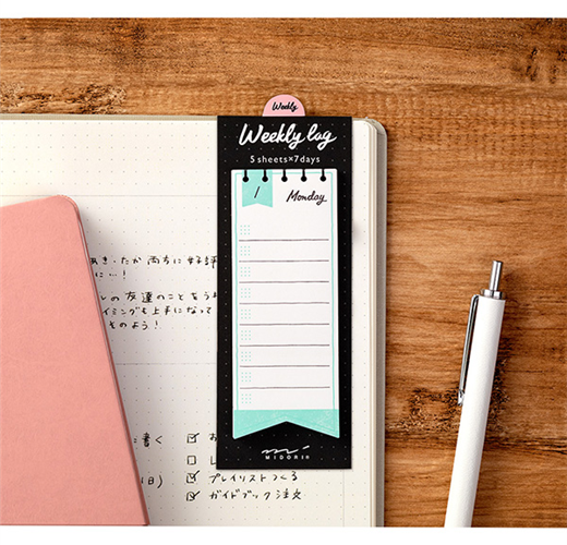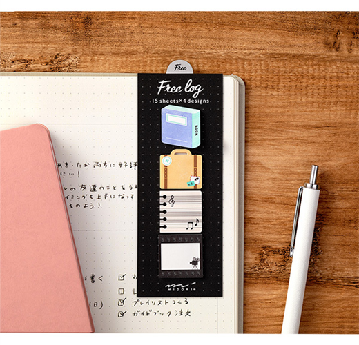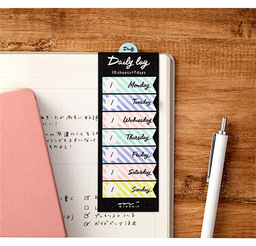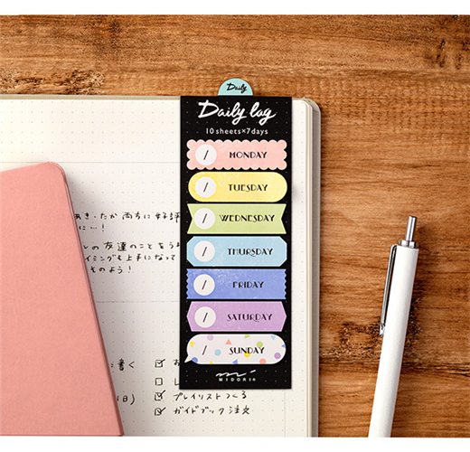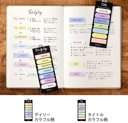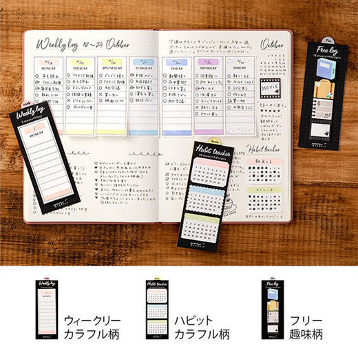 樣式總共有5種類型共10款。有已寫上星期只需填入月份與日期就可做為紀錄標題的「Daily log」便條紙,同樣也是寫上星期的TO DO LIST,可簡單整理當天待辦事項「Weekly log」便條紙,趣味可愛的「Title」便條紙則是可以幫助您管理紀錄或回憶,當您想養成一個固定習慣時就可以使用「Habit Tracker」便條紙來確認每天的達成狀況,而當您想記錄興趣、三餐聚會或是其他目的的話就可以使用自由書寫的單一空欄便條紙「Free log」。