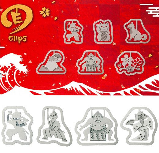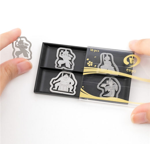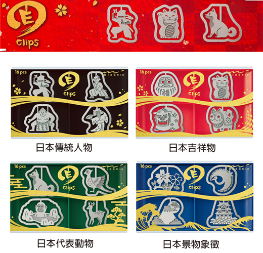 每個商品內容有4種造型夾子各有4個,總共16個。盒子設計採取從兩邊拉出滑軌,通過連接到結束傾斜的情況下,就可以順利取出,以薄夾滑動。