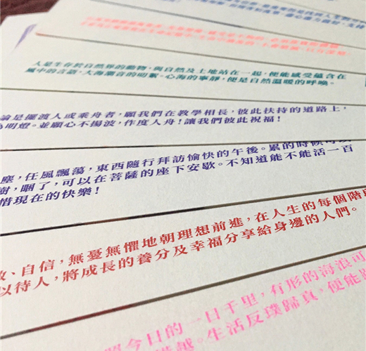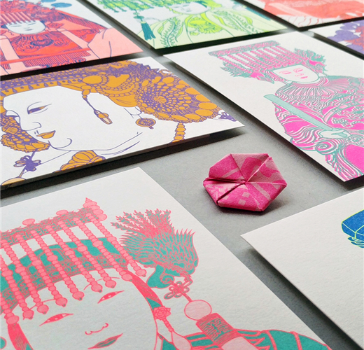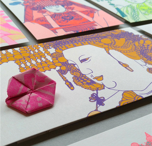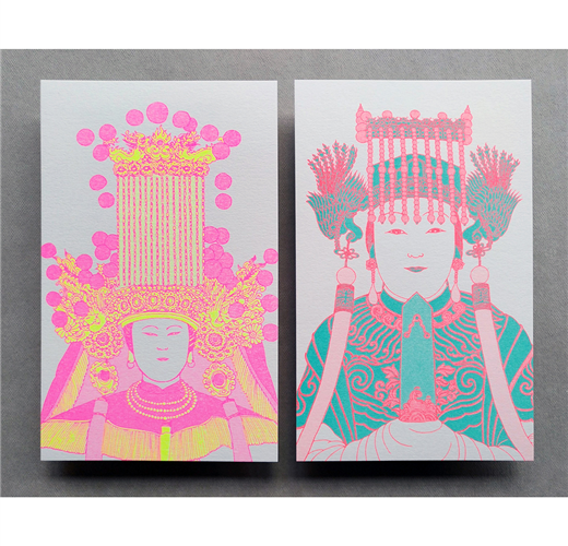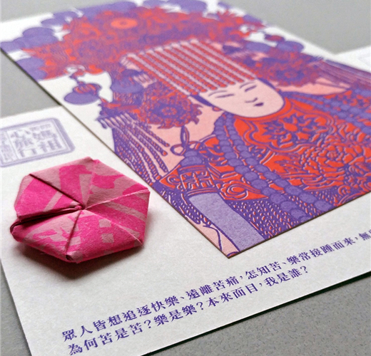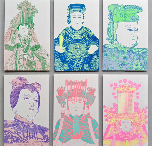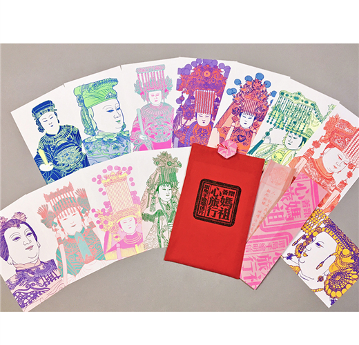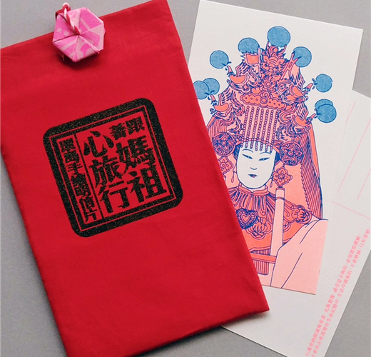 朱朱將徒步旅行時手繪的媽祖像,以孔版印刷 的方式,製作成明信片。每張明信片上印有一句旅行箴言,全套再加上一首隱藏版籤詩(隱藏版籤詩整組 14 句,隨機擇 1 句)。