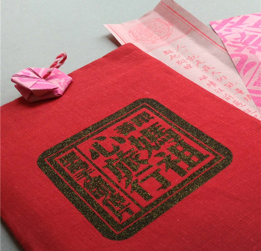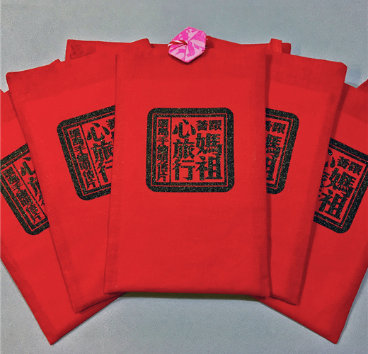 封套採用放大版香火袋,手工絹印黑金色印紋,象徵跟著媽祖婆旅行的 13 道錦囊妙計,在人生路上給予正能量的支持及鼓勵。