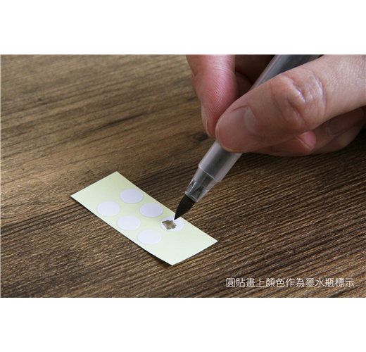 可將五種基本墨色(紅、黃、藍、灰、原液)DIY調製專屬自己喜愛的顏色後,可以內附自填式軟毛筆填色。