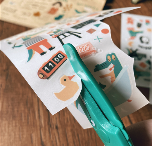 撕下表層保護膜時要慢慢撕,如果發現貼紙圖案沒有完整黏在紙張上,就壓回去反覆多刮幾次,再嘗試撕下保護膜。