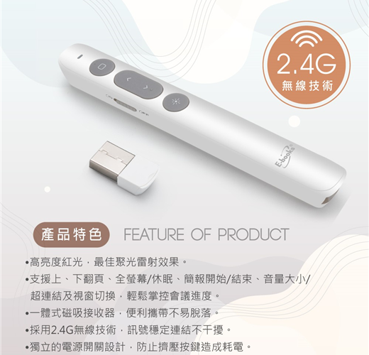 .支援上、下翻頁、全螢幕/休眠、簡報開始/結束、音量大小/