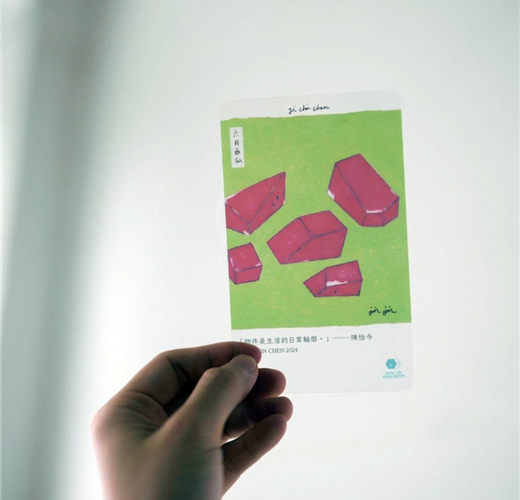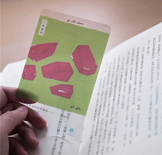 「想擁有透光性的產品,是想傳達光線對我創作基底的重要性,以各種有光線的視角來進行描繪與設計。掛暦裡的圖,部分物件被我加上的影子的元素,光線滯留在畫面空間裡的就是我的時間,珍貴的當下。透明書籤上的《六月西瓜》圖,西瓜本身清透、富含飽滿水分的質地,很適合用這個材質來詮釋。期待擁有這些物件的你,心裡變得清涼透徹、光線充足。」